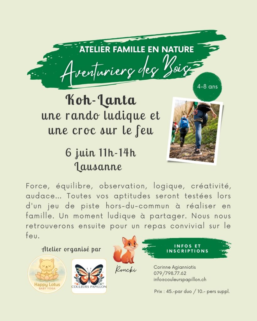 Pars à l’aventure avec Roucky, un petit renard coquin qui t’accompagnera pour te faire découvrir la forêt. 3 heures en nature pour vivre un moment hors-du-temps en famille. Activités créatives, jeux, chasse aux trésors, observation de la nature, préparation d’un feu, goûter ensemble. Chaque rencontre est guidée par un fil rouge, un thème ou une histoire.